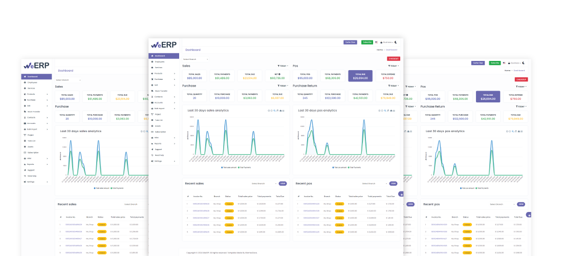 The fastest web and best ERP management system allows an organization to business easily. Admin can see all branch summery in their dashboard. for example: sales, pos, recent sales, recent pos. and their can see per month their sales charts and pos charts.