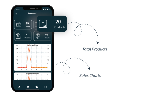 How much products are here in this business and sales, purchase, purchase return also can see sales charts and purchase charts in this dashboard.