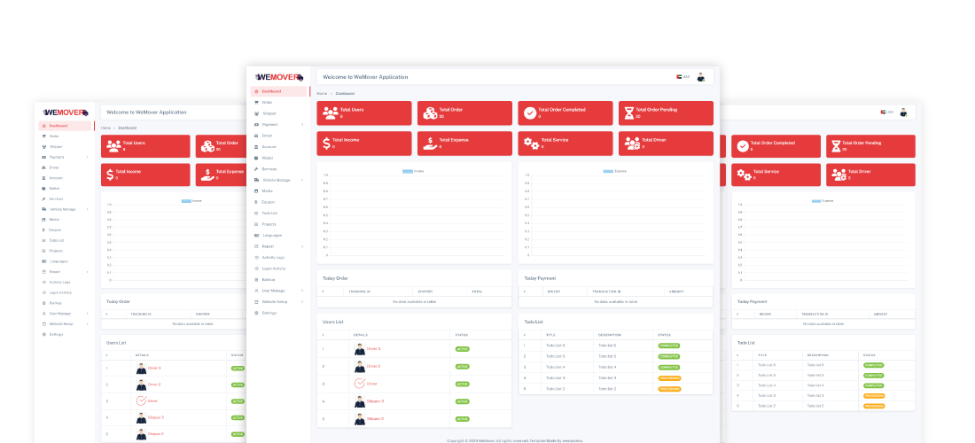 The fastest web and best WeMover goods delivery system allows an organization to business easily. Admin can see all summery in their dashboard. for example: users, roles, orders, completed order,pending orders, income, expense, services , drivers and etc.
