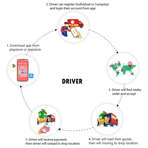 Driver can accept their near orders and he can load goods from shipper and driver will goes to drop location and then driver will unload and will receive payment from shipper.